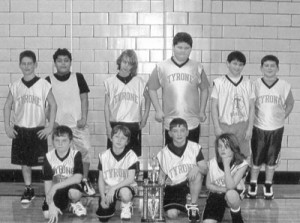The Tyrone fourth/fifth grade boys basketball team placed second in a tournament at the Jewish Memorial Center in Altoona. Kneeling (left to right): Mark Lewis, JoJo Steinbugl, Tom Williams, and Shane Geis. Standing: Nathaniel Soellner, Elijah DeHaven, Blake Brooks, Preston Mitchell, Tristan Lingafelt, and Zack Soellner. (The Daily Herald/Courtesy Photo)