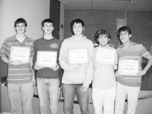 The Tyrone Boys Soccer Boosters Club held their award banquet on Sunday afternoon, Dec. 9, 2007 at the Tyrone Area High School cafeteria. The guest speaker was PSU Altoona soccer coach John Parente. Presentaions were made to all seniors by the Booster Club. (Left to right): Chad Smith was presented with the Most Improved Player, Dudley McNitt was selected for the Sportsmanship Award, Dustin Elder won the Leadership Award, and Jon Hampton and Chad Hunter were chosen as Co-Most Valuable Players. (The Daily Herald/Courtesy Photo)