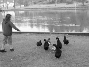 While 11-year-old Mercedes Robinson of Tyrone feeds the ducks at Reservoir Park, a number of wild ducks on the lake soon head toward shore for some treats too. This photo was taken before the area got a blast of wintry weather. (The Daily Herald/Virgie Werner)