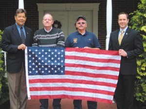 State Representatives Jerry Stern and Mike Fleck donated 25 American flags to Tyrone Flag Project Committee representatives George Bonsell Jr. and Bob Nein. There are about 80 flags put up downtown for Veteran’s Day, and some of the flags needed to be replaced because of deterioration. The flags will go up the Sunday before Veteran’s Day, and they will display proudly for two weeks. Rep. Stern and Fleck both stated that they are always willing to help out the citizens and volunteers, and they appreciate these gentlemen pursuing this project to display the flags. It’s always nice to see Tyrone displaying the flag proudly and to see our small town so patriotic, and the volunteers willing to do what they do every year. From left, holding one of the new flags: Rep. Jerry Stern, George Bonsell Jr. of the flag committee, Bob Nein of the flag committee and Rep. Mike Fleck. (The Daily Herald/Kris Yaniello)
