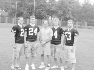 Tyrone Area High School was one of many area football teams to participate in the WTAJ-TV Media Day at Mansion Park on Tuesday. From left to right: Johnny Franco, Shayne Tate, Coach John Franco, Shane Emigh and Josh Bradley. (The Daily Herald/Bob Miller)Golden Eagles Tyrone Area High School was one of many area football teams to participate in the WTAJ-TV Media Day at Mansion Park on Tuesday. From left to right: Johnny Franco, Shayne Tate, Coach John Franco, Shane Emigh and Josh Bradley. (The Daily Herald/Bob Miller)