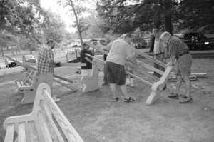 The area in front of the Reservoir Park Amphitheater is being enhanced by the addition of eight park benches to provide more comfortable seating for persons attending concerts and community functions held there. A project of Tyrone Rotary Club, members were busy putting the benches together and in place at their meeting held in the park recently. The benches are approximately six feet in length and are constructed of concrete end caps with 2 x 4 boards placed for the seat and back. The benches are secured in place by a rebar attached to the underside of the concrete end and placed in approximately 24 inches deep of concrete. Rotary President William Bell said members placed the benches for ease of maneuverability of people attending events there as it adds some seating arrangement to the area. He added the Rotary Club would like to thank Jim Clark Jr. for helping to load and unload the benches at the park and for helping set them where they needed to be. (The Daily Herald/Virgie Werner)