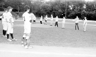 Members of the 1957 Altoona team which won the NABF National Tournament at the Cricket Field in Altoona, were honored at ceremonies at Vets Field on Thursday. Each of the members threw a ceremonial first pitch to a member of the 2007 Kelley Federation champion Martin Oil team. On the left are Chad Coho (36), Justin Miller and Jake Manning (3) catching the throws. Second from the right is Tyrone native Dick Rupert (throwing left-handed), now a resident of nearby Petersburg, who was a member of the 1957 championship team. (The Daily Herald/Stacey Manning)